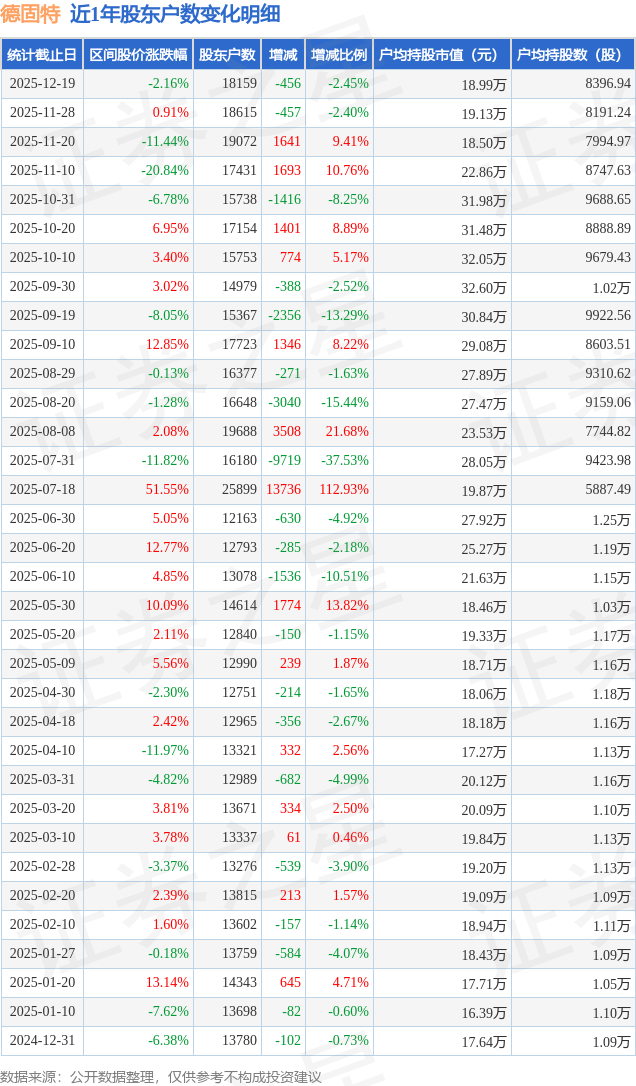 从股价来看,2025年12月10日至2025年12月19日,德固特区间跌幅为2.16%,在此期间股东户数减少456.0户,减幅为2.45%。