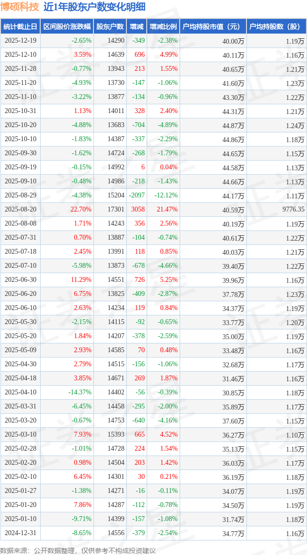 从股价来看,2025年12月10日至2025年12月19日,博硕科技区间跌幅为2.65%,在此期间股东户数减少349.0户,减幅为2.38%。