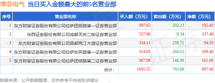 证券之星消息,沪深交易所2025年12月22日公布的交易公开信息显示,博菲电气(001255)因日跌幅偏离值达到7%的前5只证券登上龙虎榜。此次是近5个交易日内第4次上榜。