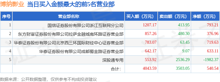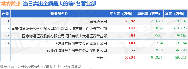 证券之星消息,沪深交易所2025年12月22日公布的交易公开信息显示,博纳影业(001330)因日跌幅偏离值达到7%的前5只证券登上龙虎榜。此次是近5个交易日内第4次上榜。
