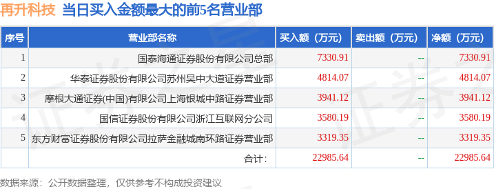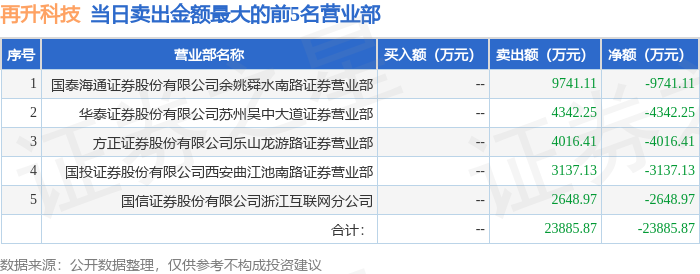 证券之星消息,沪深交易所2025年12月22日公布的交易公开信息显示,再升科技(603601)因有价格涨跌幅限制的日换手率达到20%的前五只证券登上龙虎榜。此次是近5个交易日内第5次上榜。