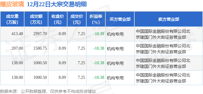 证券之星消息,12月22日耀皮玻璃发生大宗交易,交易数据如下: