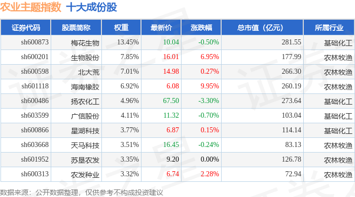 证券之星消息,12月22日,农业主题(000122)指数报收于1644.53点,涨0.91%,成交59.18亿元,换手率2.31%。当日该指数成份股中,上涨的有19家,海南橡胶以9.95%的涨幅领涨,下跌的有12家,扬农化工以3.3%的跌幅领跌。