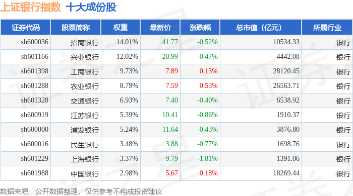 证券之星消息,12月22日,上证银行(000134)指数报收于1033.05点,跌0.52%,成交176.11亿元,换手率0.18%。当日该指数成份股中,上涨的有5家,农业银行以0.53%的涨幅领涨,下跌的有21家,渝农商行以2.15%的跌幅领跌。