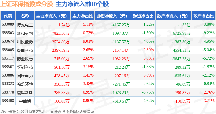 资金流向方面,上证环保(000158)指数成份股当日主力资金净流出合计10.01亿元,游资资金净流入合计3.96亿元,散户资金净流入合计6.04亿元。成份股资金流向详情见下表: