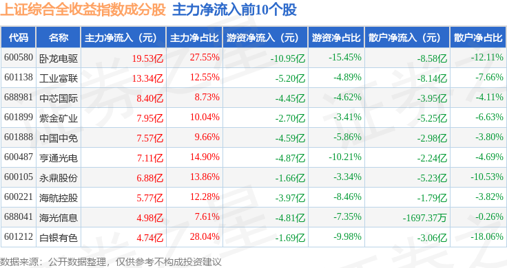 资金流向方面,上证综合全收益(000888)指数成份股当日主力资金净流出合计1224.36万元,游资资金净流出合计51.95亿元,散户资金净流入合计52.07亿元。成份股资金流向详情见下表: