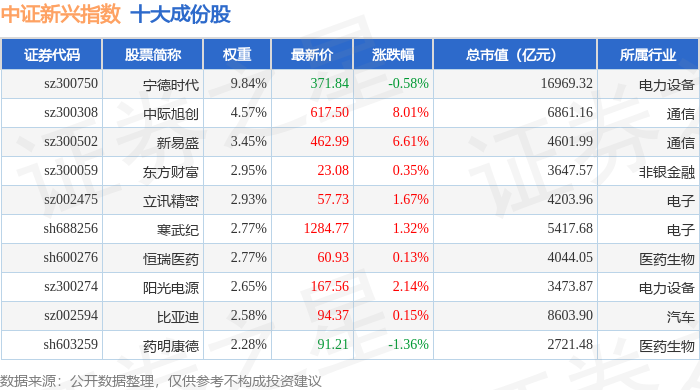 证券之星消息,12月22日,中证新兴(000964)指数报收于11008.48点,涨1.92%,成交2862.29亿元,换手率1.29%。当日该指数成份股中,上涨的有73家,卧龙电驱以9.99%的涨幅领涨,下跌的有25家,宇通客车以2.47%的跌幅领跌。
