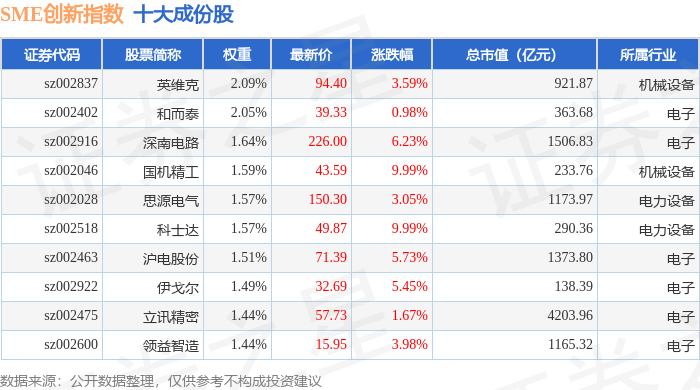 证券之星消息,12月22日,SME创新(399017)指数报收于4850.7点,涨1.79%,成交1040.26亿元,换手率2.28%。当日该指数成份股中,上涨的有76家,兆威机电以10.0%的涨幅领涨,下跌的有22家,航天电器以2.28%的跌幅领跌。