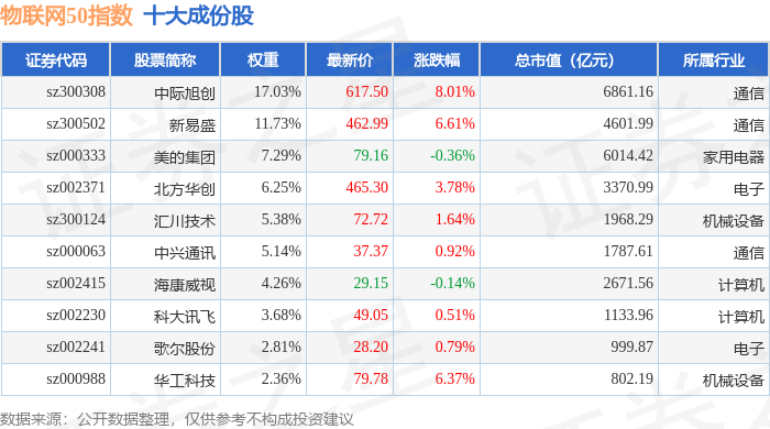 物联网50(399285)指数十大成份股详情如下: