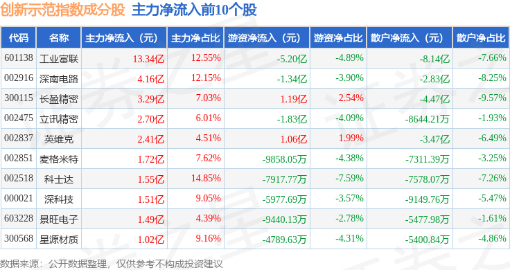 资金流向方面,创新示范(399351)指数成份股当日主力资金净流入合计23.02亿元,游资资金净流出合计5.89亿元,散户资金净流出合计17.13亿元。成份股资金流向详情见下表: