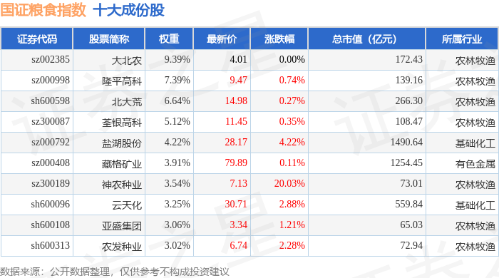 证券之星消息,12月22日,国证粮食(399365)指数报收于13518.9点,涨1.17%,成交187.41亿元,换手率2.14%。当日该指数成份股中,上涨的有25家,神农种业以20.03%的涨幅领涨,下跌的有20家,扬农化工以3.3%的跌幅领跌。