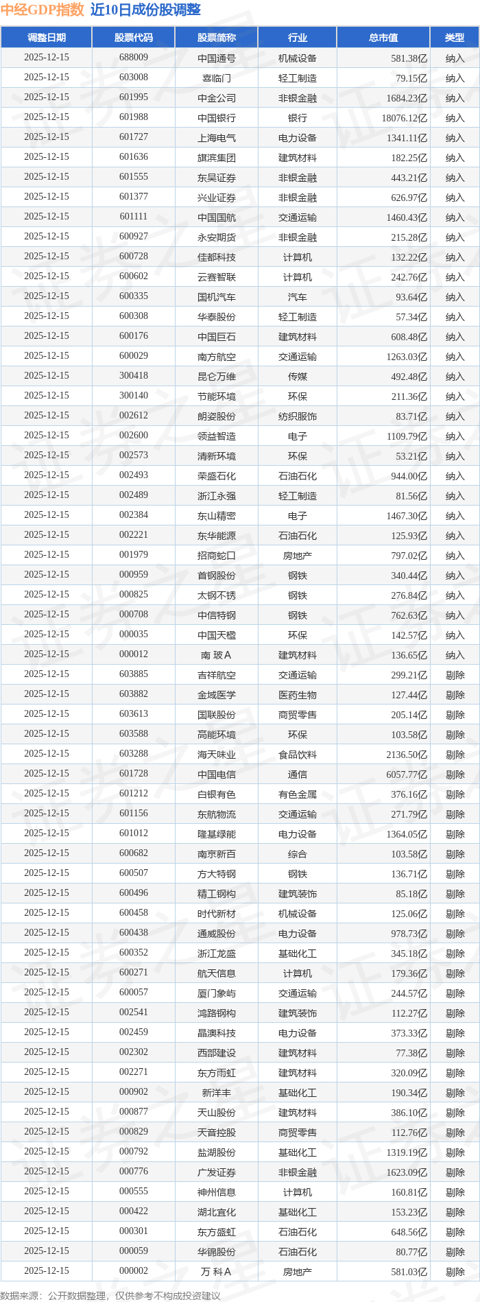 中经GDP(399399)指数十大成份股详情如下: