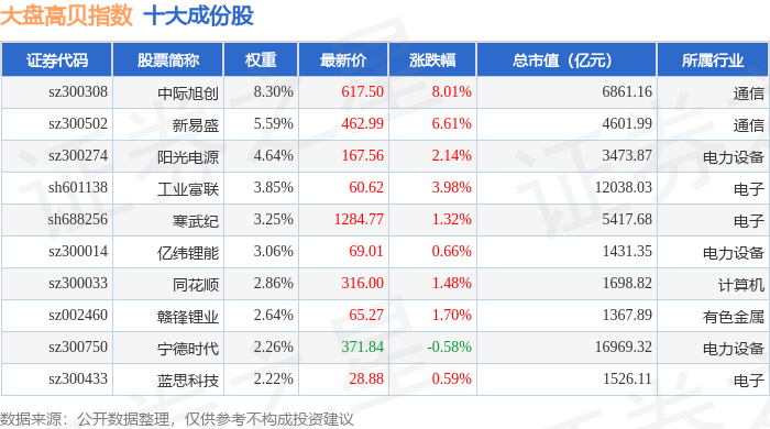 大盘高贝(399405)指数十大成份股详情如下: