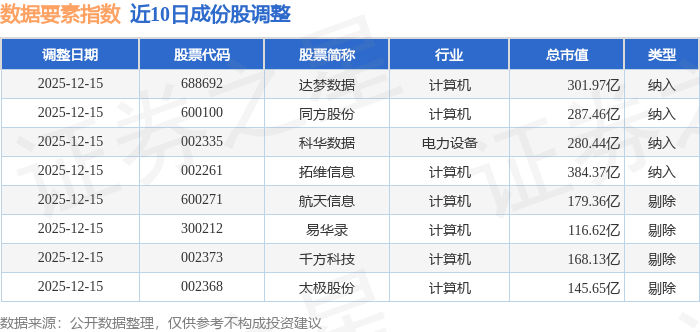 近10日内数据要素(399418)指数成份股做了调整,新纳入了4只股票,剔除了4只股票。