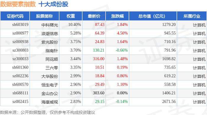 资金流向方面,数据要素(399418)指数成份股当日主力资金净流出合计16.34亿元,游资资金净流入合计4.85亿元,散户资金净流入合计11.49亿元。成份股资金流向详情见下表: