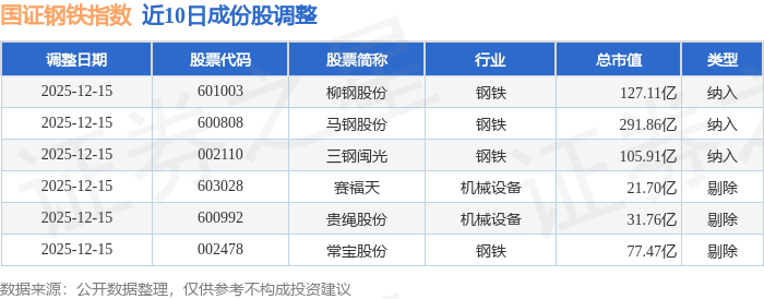 近10日内国证钢铁(399440)指数成份股做了调整,新纳入了3只股票,剔除了3只股票。
