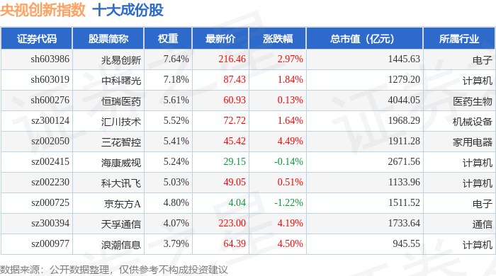 证券之星消息,12月22日,央视创新(399551)指数报收于10151.51点,涨2.15%,成交767.63亿元,换手率2.08%。当日该指数成份股中,上涨的有32家,亨通光电以10.02%的涨幅领涨,下跌的有14家,双鹭药业以2.54%的跌幅领跌。