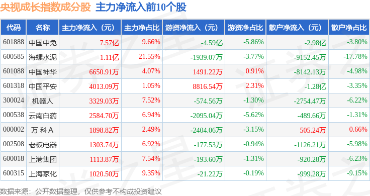 资金流向方面,央视成长(399552)指数成份股当日主力资金净流出合计15.82亿元,游资资金净流入合计7.81亿元,散户资金净流入合计8.0亿元。成份股资金流向详情见下表: