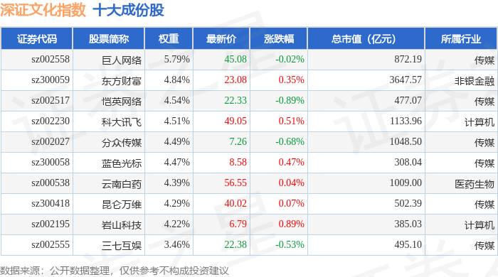 证券之星消息,12月22日,深证文化(399654)指数报收于2803.24点,跌0.19%,成交289.65亿元,换手率2.33%。当日该指数成份股中,上涨的有22家,通化金马以2.0%的涨幅领涨,下跌的有27家,电广传媒以3.6%的跌幅领跌。