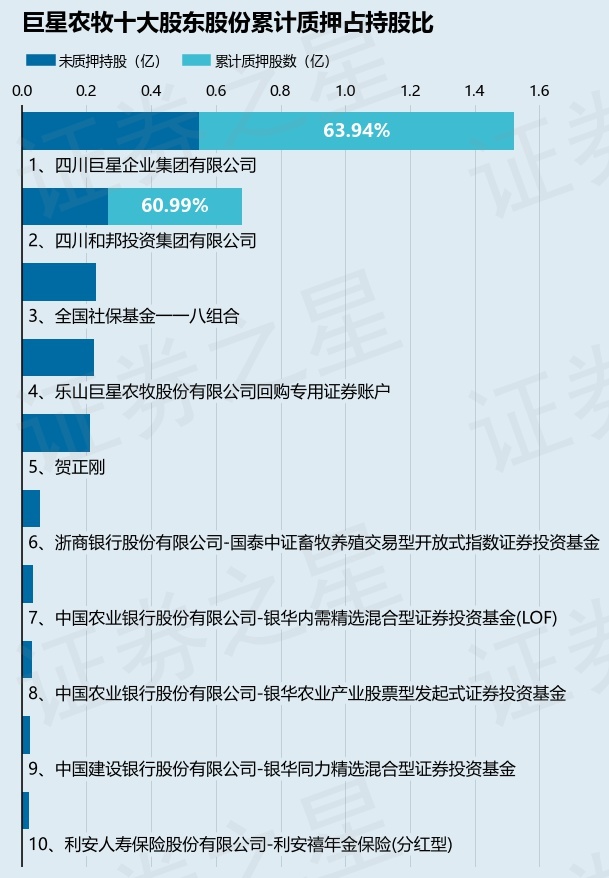 截止本公告日,股东四川巨星企业集团有限公司已累计质押股份9737.1万股,占其持股总数的63.94%,股东四川和邦投资集团有限公司已累计质押股份4150.0万股,占其持股总数的60.99%。本次质押后巨星农牧十大股东的累计质押股份占持股比例(占持股比例的计算以公司最新一期财务报表公布的十大股东的持股总数为基准)见下图: