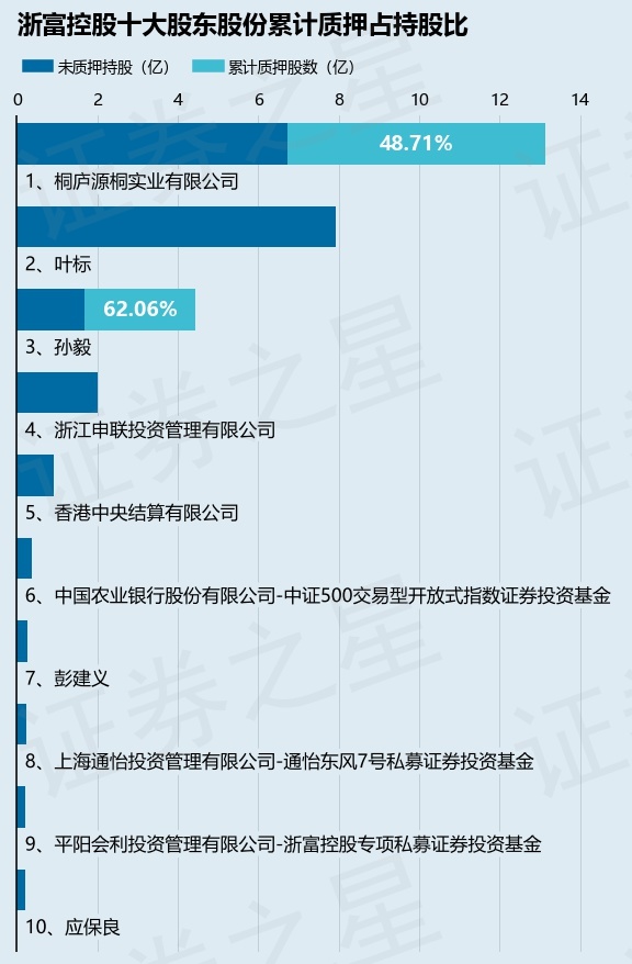 截止本公告日,股东桐庐源桐实业有限公司已累计质押股份6.39亿股,占其持股总数的48.71%,股东孙毅已累计质押股份2.76亿股,占其持股总数的62.06%。本次质押后浙富控股十大股东的累计质押股份占持股比例(占持股比例的计算以公司最新一期财务报表公布的十大股东的持股总数为基准)见下图: