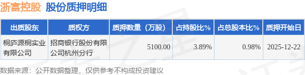 证券之星消息,浙富控股(002266)12月22日公开信息显示,股东桐庐源桐实业有限公司向招商银行股份有限公司杭州分行合计质押5100.0万股,占总股本0.98%。质押详情见下表: