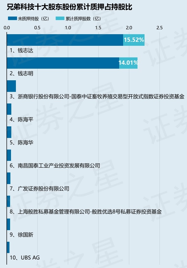 截止本公告日,股东钱志达已累计质押股份3500.0万股,占其持股总数的15.52%,股东钱志明已累计质押股份3000.0万股,占其持股总数的14.01%。本次质押后兄弟科技十大股东的累计质押股份占持股比例(占持股比例的计算以公司最新一期财务报表公布的十大股东的持股总数为基准)见下图: