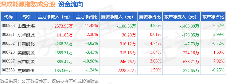 资金流向方面,深成能源(399680)指数成份股当日主力资金净流出合计881.04万元,游资资金净流入合计2033.99万元,散户资金净流出合计1152.96万元。成份股资金流向详情见下表: