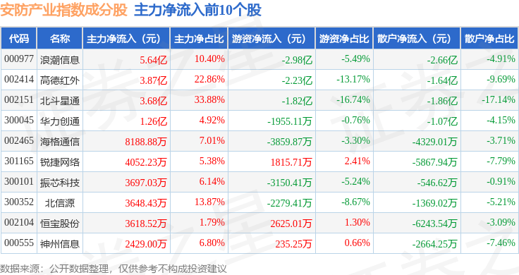 资金流向方面,安防产业(399693)指数成份股当日主力资金净流入合计10.23亿元,游资资金净流出合计11.06亿元,散户资金净流入合计8329.49万元。成份股资金流向详情见下表: