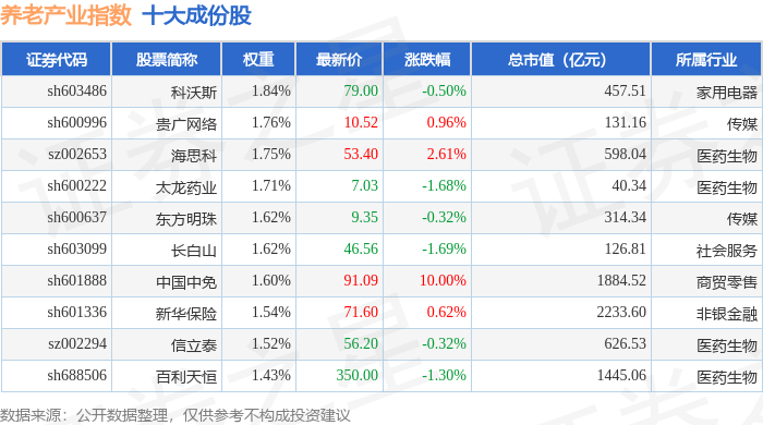 养老产业(399812)指数十大成份股详情如下: