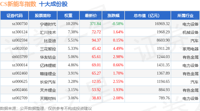 CS新能车(399976)指数十大成份股详情如下:
