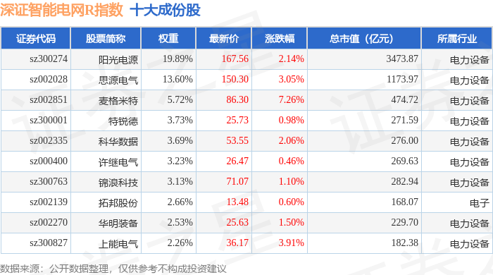 证券之星消息,12月22日,深证智能电网R(470054)指数报收于4229.77点,涨2.1%,成交270.05亿元,换手率2.77%。当日该指数成份股中,上涨的有36家,科士达以9.99%的涨幅领涨,下跌的有13家,昇辉科技以3.12%的跌幅领跌。