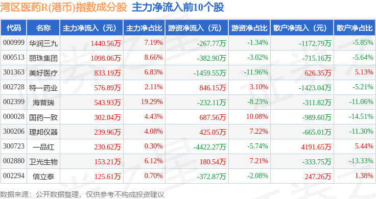 资金流向方面,湾区医药R(港币)(480014)指数成份股当日主力资金净流出合计1.36亿元,游资资金净流出合计3372.95万元,散户资金净流入合计1.69亿元。成份股资金流向详情见下表: