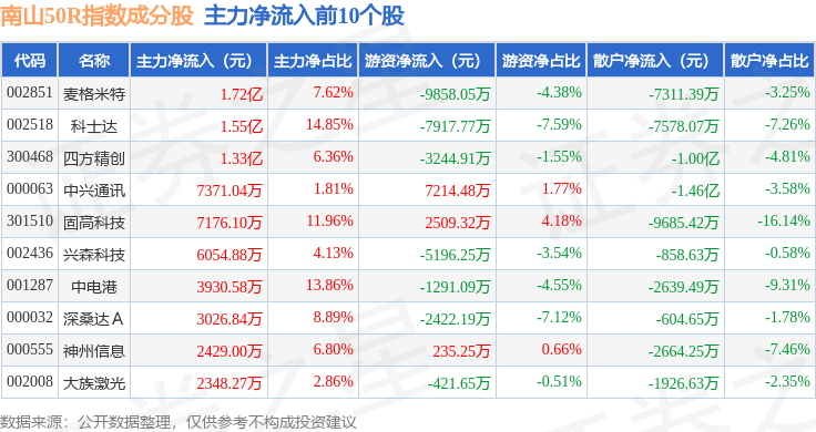 资金流向方面,南山50R(480023)指数成份股当日主力资金净流入合计1.45亿元,游资资金净流出合计923.86万元,散户资金净流出合计1.36亿元。成份股资金流向详情见下表: