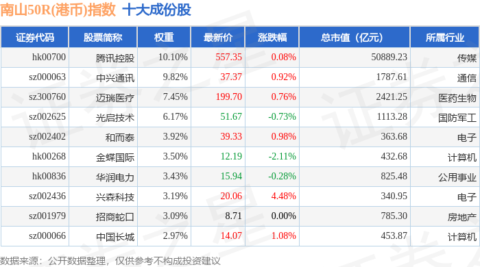 南山50R(港币)(480024)指数十大成份股详情如下: