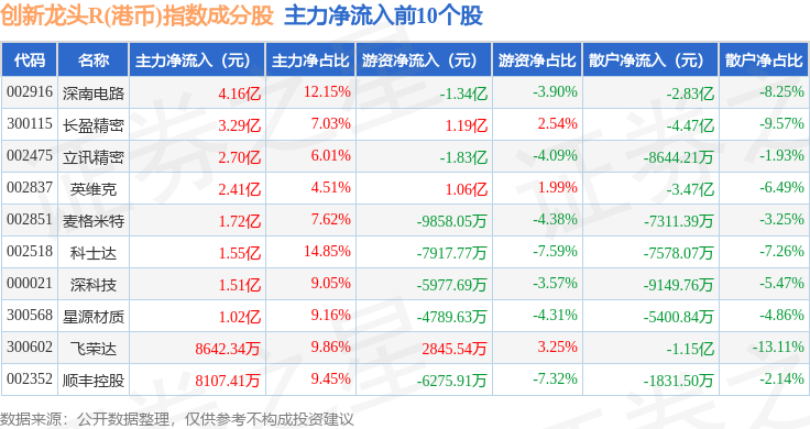 资金流向方面,创新龙头R(港币)(480037)指数成份股当日主力资金净流入合计11.84亿元,游资资金净流出合计1.74亿元,散户资金净流出合计10.1亿元。成份股资金流向详情见下表: