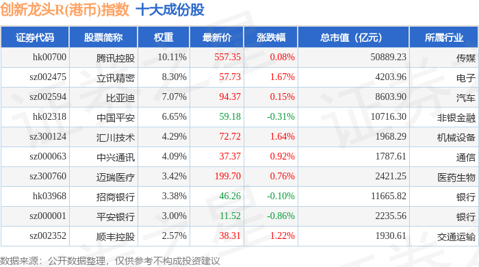 创新龙头R(港币)(480037)指数十大成份股详情如下:
