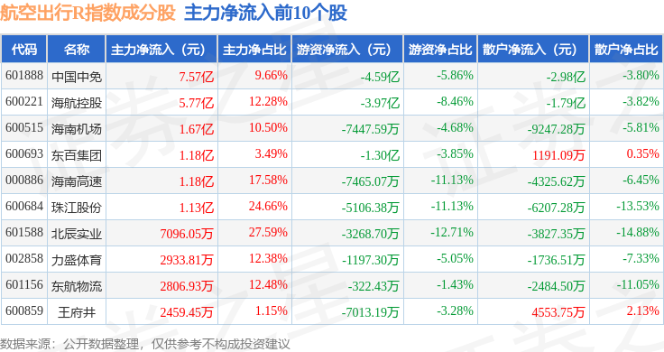 资金流向方面,航空出行R(480059)指数成份股当日主力资金净流入合计5.02亿元,游资资金净流出合计11.98亿元,散户资金净流入合计6.95亿元。成份股资金流向详情见下表: