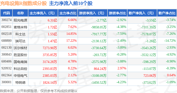 资金流向方面,充电设施R(480077)指数成份股当日主力资金净流入合计10.31亿元,游资资金净流出合计4.37亿元,散户资金净流出合计5.61亿元。成份股资金流向详情见下表: