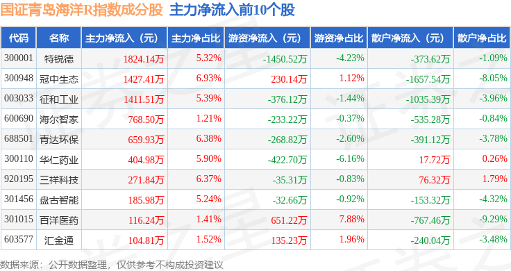 资金流向方面,国证青岛海洋R(480532)指数成份股当日主力资金净流出合计1.4亿元,游资资金净流入合计1814.14万元,散户资金净流入合计1.11亿元。成份股资金流向详情见下表: