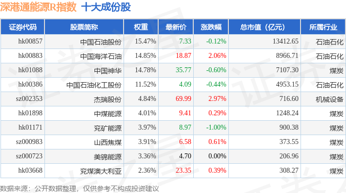 资金流向方面,深港通能源R(483013)指数成份股当日主力资金净流出合计1941.18万元,游资资金净流入合计5029.43万元,散户资金净流出合计3088.25万元。成份股资金流向详情见下表: