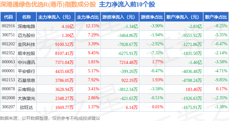 资金流向方面,深港通绿色优选R(港币)(483012)指数成份股当日主力资金净流出合计13.72亿元,游资资金净流入合计7.7亿元,散户资金净流入合计6.02亿元。成份股资金流向详情见下表: