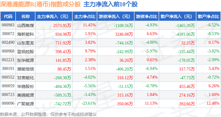 资金流向方面,深港通能源R(港币)(483014)指数成份股当日主力资金净流出合计1941.18万元,游资资金净流入合计5029.43万元,散户资金净流出合计3088.25万元。成份股资金流向详情见下表: