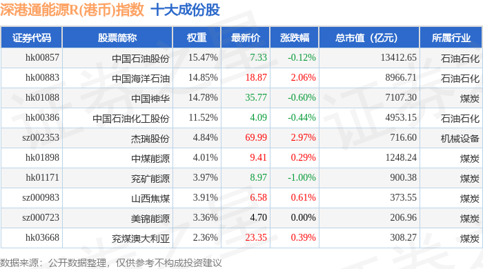 深港通能源R(港币)(483014)指数十大成份股详情如下: