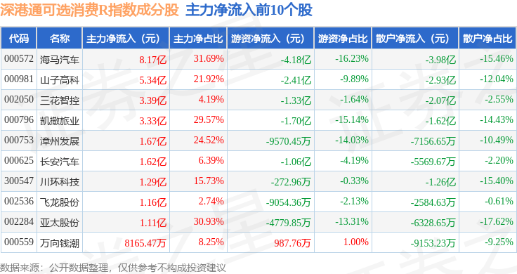 资金流向方面,深港通可选消费R(483019)指数成份股当日主力资金净流出合计6.2亿元,游资资金净流出合计4.84亿元,散户资金净流入合计11.04亿元。成份股资金流向详情见下表:
