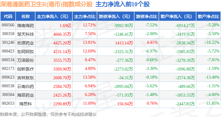 资金流向方面,深港通医药卫生R(港币)(483024)指数成份股当日主力资金净流出合计9.67亿元,游资资金净流入合计7789.22万元,散户资金净流入合计8.89亿元。成份股资金流向详情见下表: