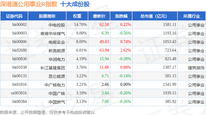 深港通公用事业R(483031)指数十大成份股详情如下:
