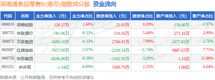 资金流向方面,深港通食品零售R(港币)(483038)指数成份股当日主力资金净流出合计3.17亿元,游资资金净流入合计1275.8万元,散户资金净流入合计3.04亿元。成份股资金流向详情见下表: