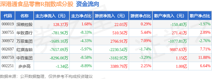 资金流向方面,深港通食品零售R(483037)指数成份股当日主力资金净流出合计3.17亿元,游资资金净流入合计1275.8万元,散户资金净流入合计3.04亿元。成份股资金流向详情见下表: