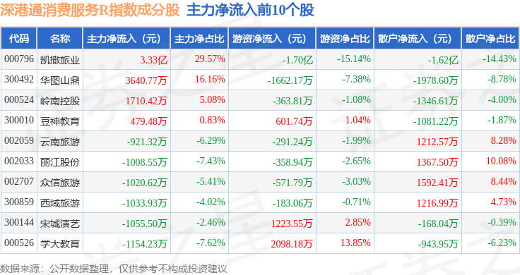 资金流向方面,深港通消费服务R(483045)指数成份股当日主力资金净流入合计1.03亿元,游资资金净流出合计1.4亿元,散户资金净流入合计3644.46万元。成份股资金流向详情见下表: